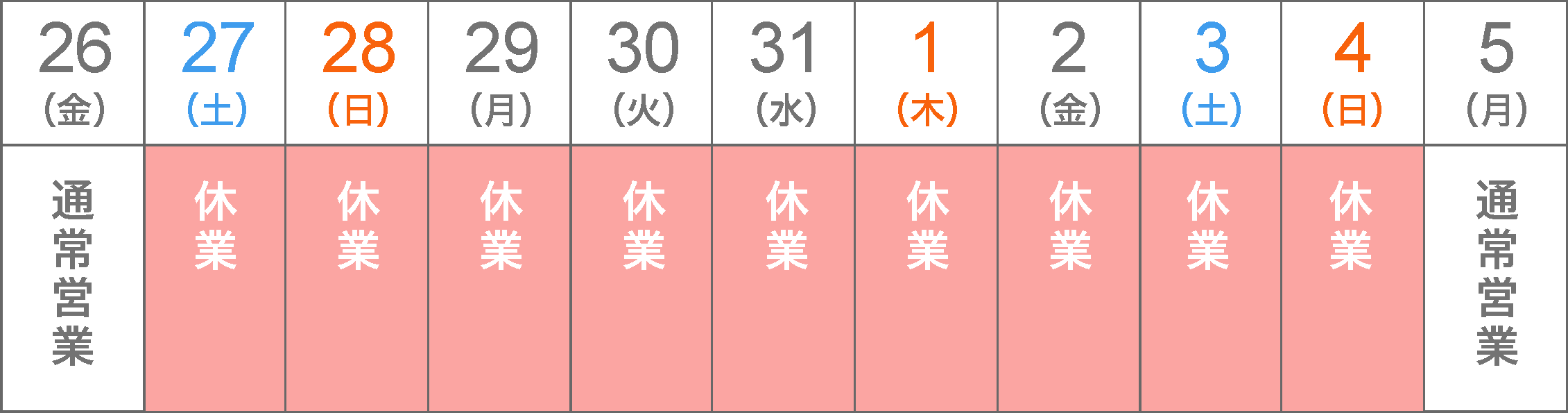 冬季休業中の営業日は下記の通りとなります。ご不便おかけしますが何卒よろしくお願いいたします。