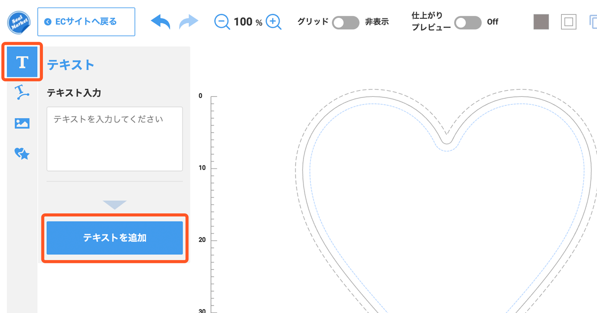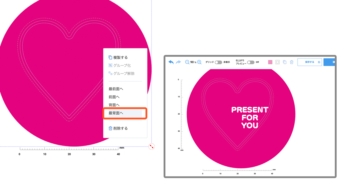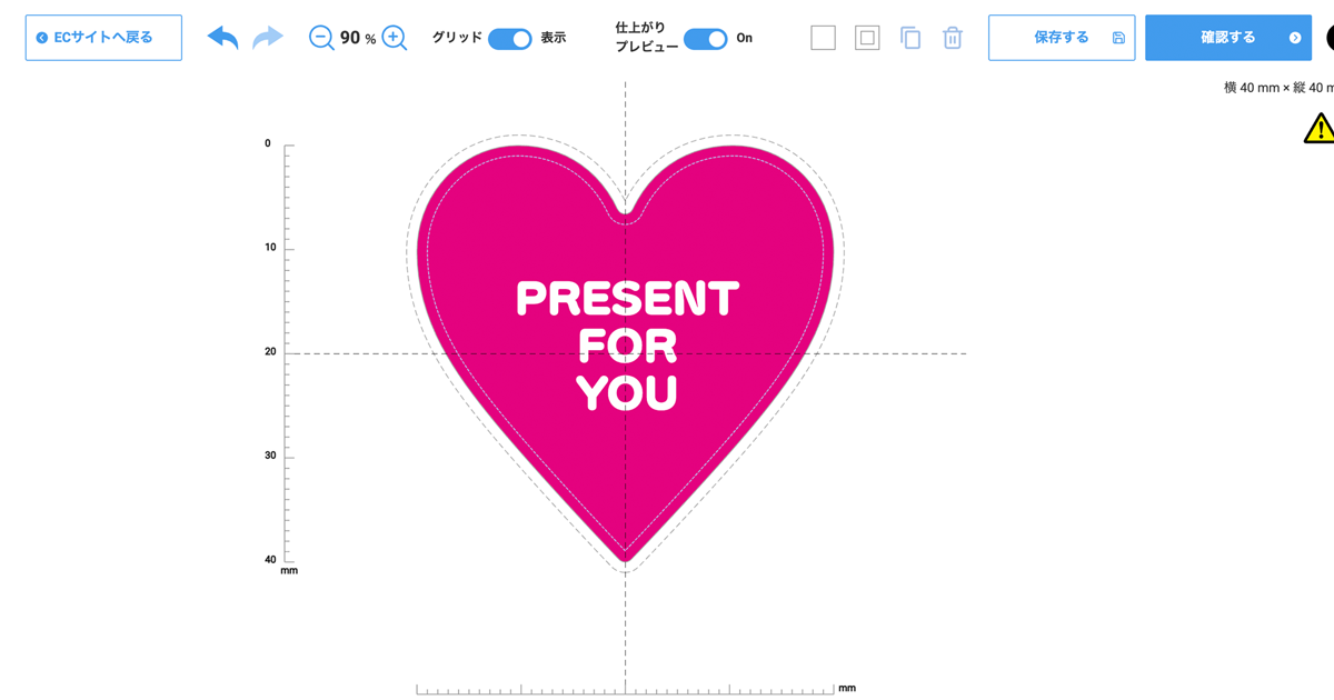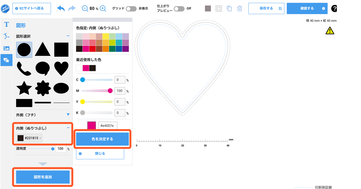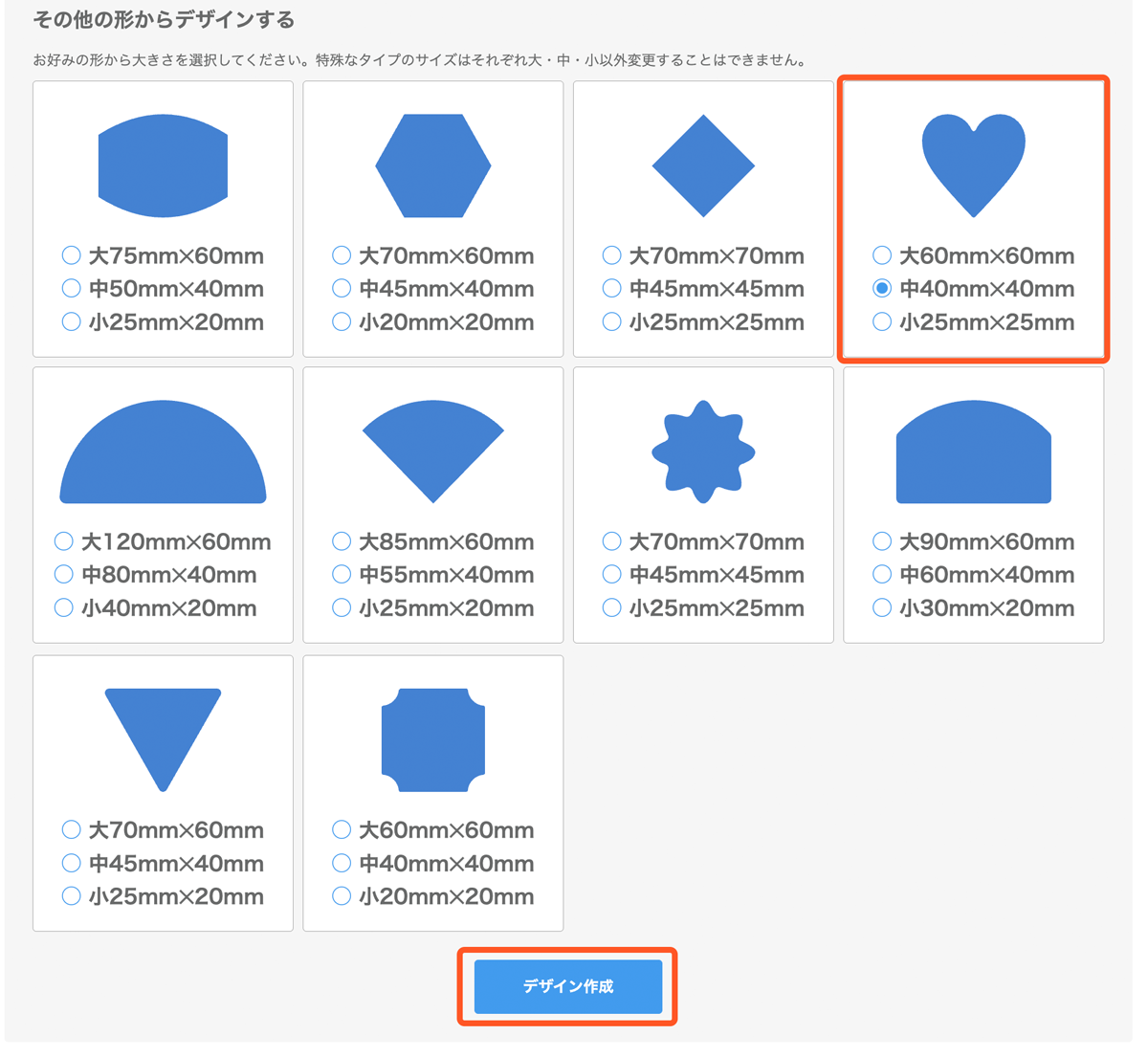 ハートの形(中・40mm×40mm)を選択して「デザイン作成」をクリックする。