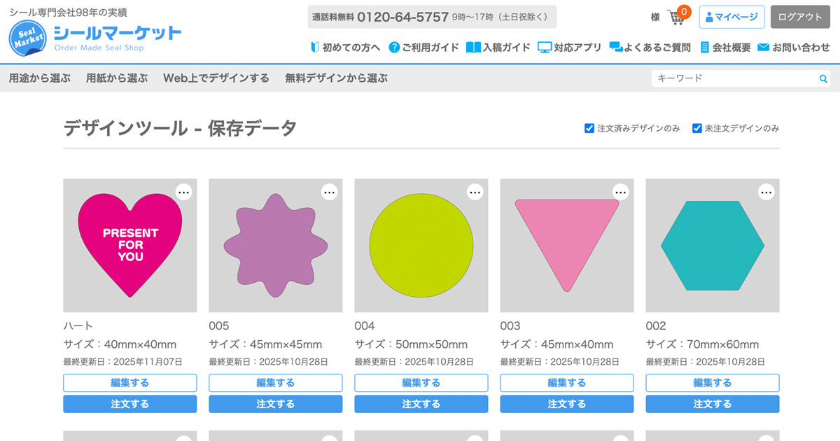 保存したデータはマイページの「マイデザイン」>「デザインツール - 保存データ」から確認することができます。
