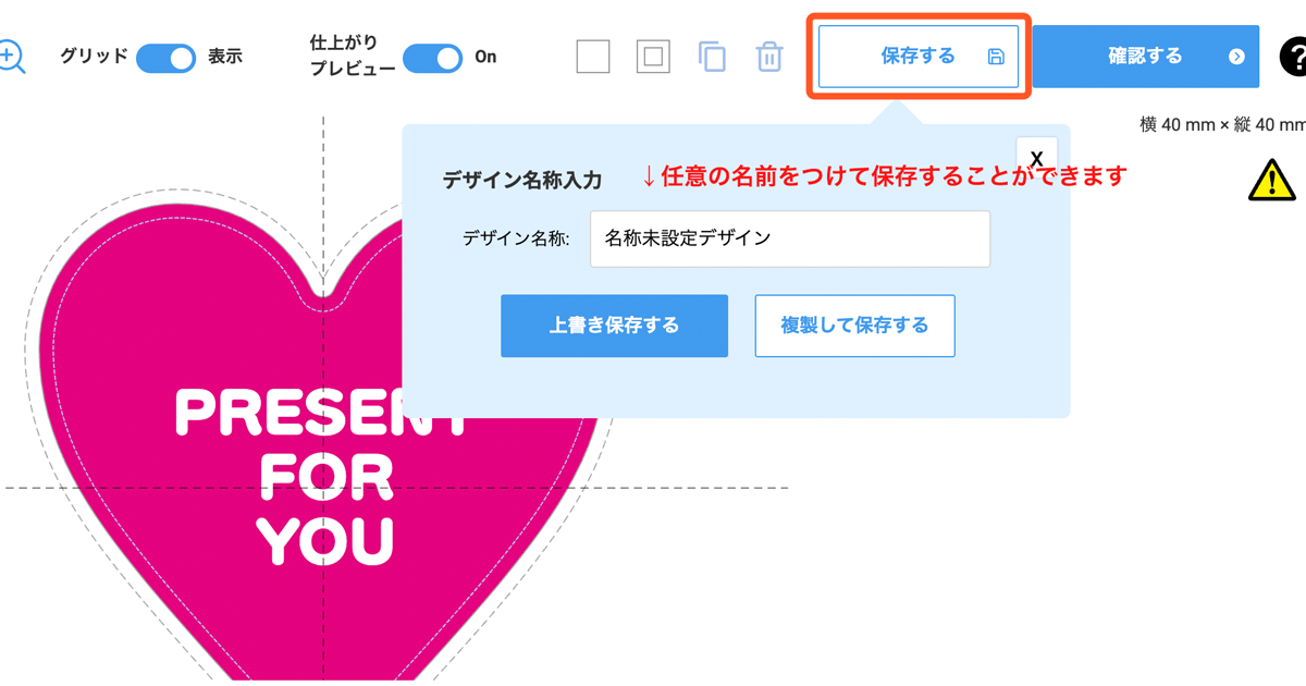 デザイン名称を入力してから「上書き保存する」で保存完了。