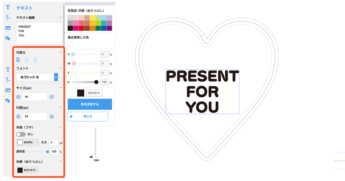 ツールの をクリックして「PRESENT FOR YOU」と入力。「テキストを追加」を押す。