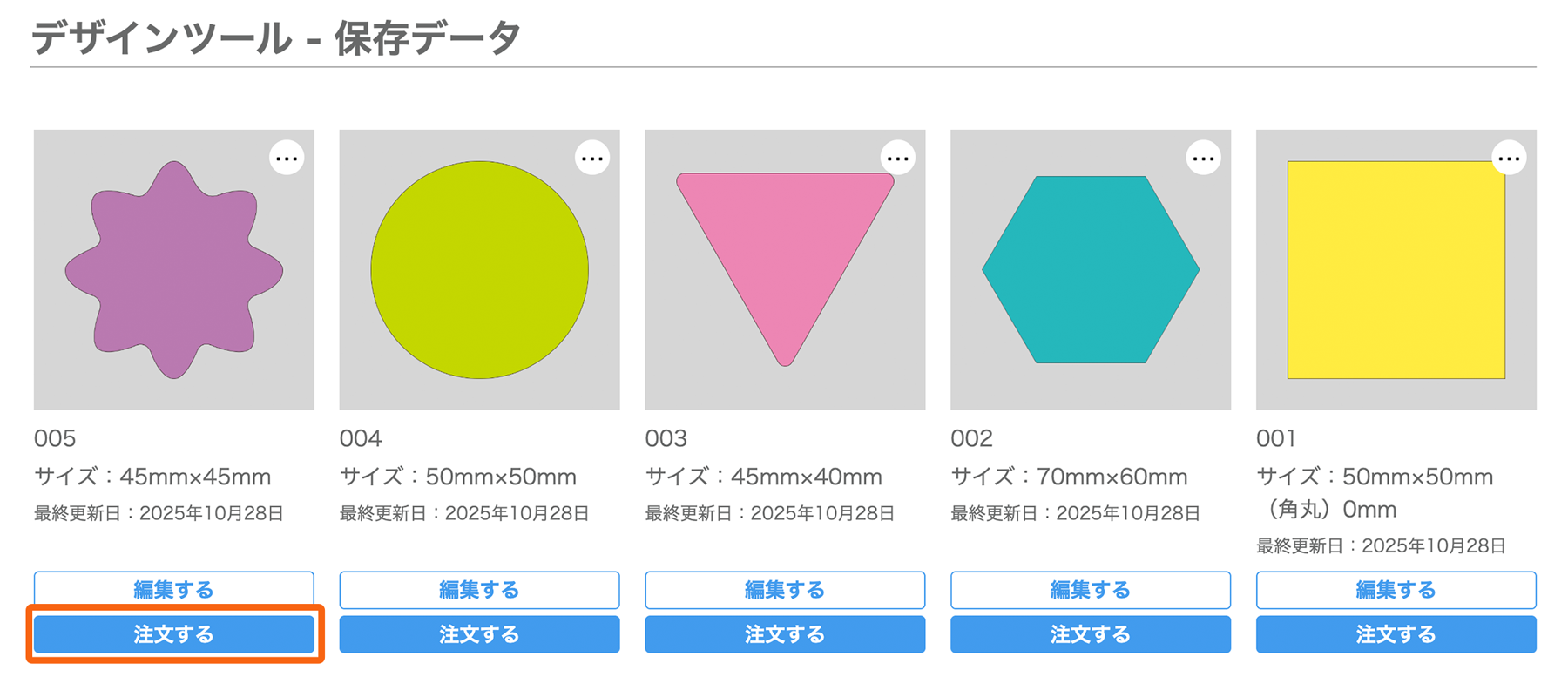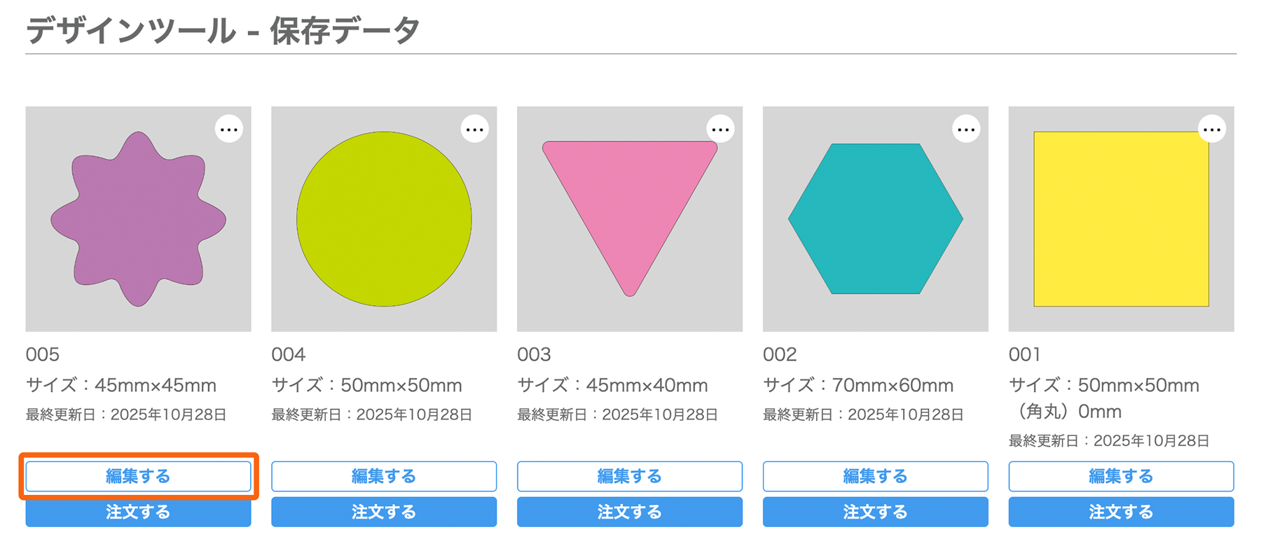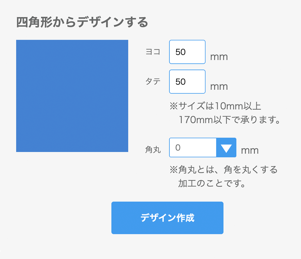 Web上でデザインするページから形状のタイプを選び、必要な項目を入力して「デザイン作成」へ進むと、オンラインデザインツールの画面が表示されます。