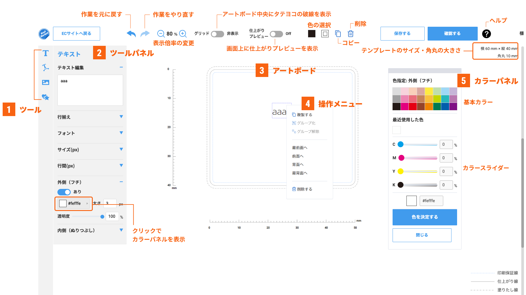 オンラインデザインツールは、ブラウザ上でシールのデザインデータを作成、編集、保存、注文まで行っていただける便利ツールです。