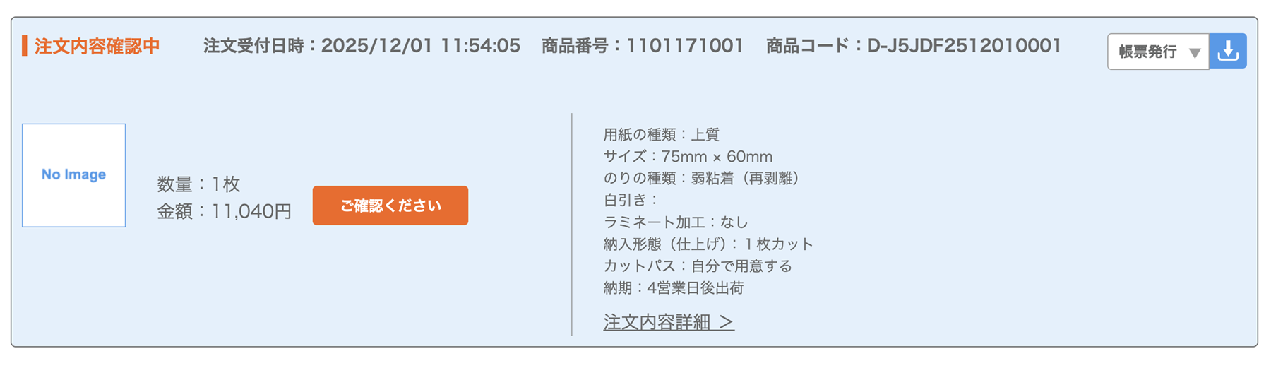 それ以降の手順は「データ入稿の仕方」の2)「用紙を選んでシールを作る」でサイズを入力し、仕様、価格を選択し「カートに入れる」以降をご参考ください。
